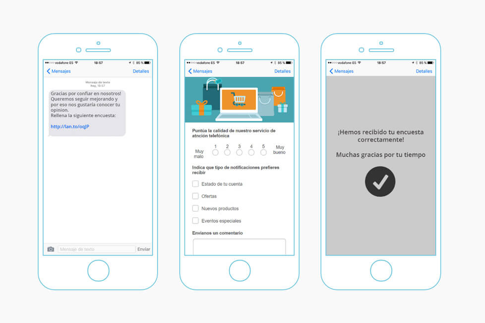 Conocer la opinión de tus clientes es primordial, y el móvil resulta ser el método más directo, rápido y eficaz de conseguirlo. Nuestra herramienta te permite incluso recibir notificaciones en tiempo real, podrás recibir, si lo deseas una notificación por SMS cada vez que alguien complete una de tus encuestas.